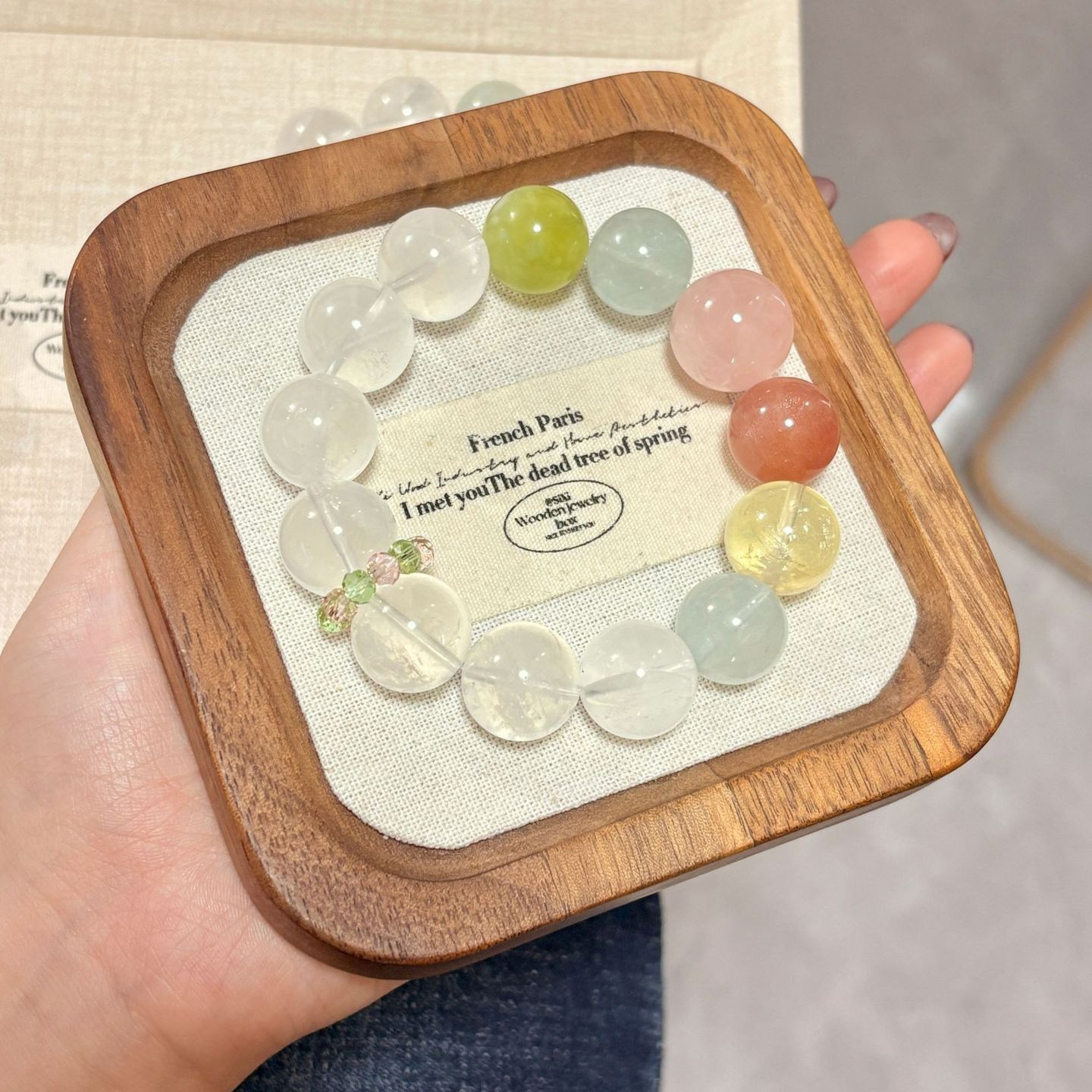 配戴注意:應避免配戴著洗澡、運動或從事經常性接觸水 / 化學液體的活動,以防止水晶內的礦物變質或遭受碰撞,造成褪色、損傷等問題,而減少水晶飾品的壽命,如有噴灑香水的習慣,建議可以噴灑完香水後再配戴飾品。