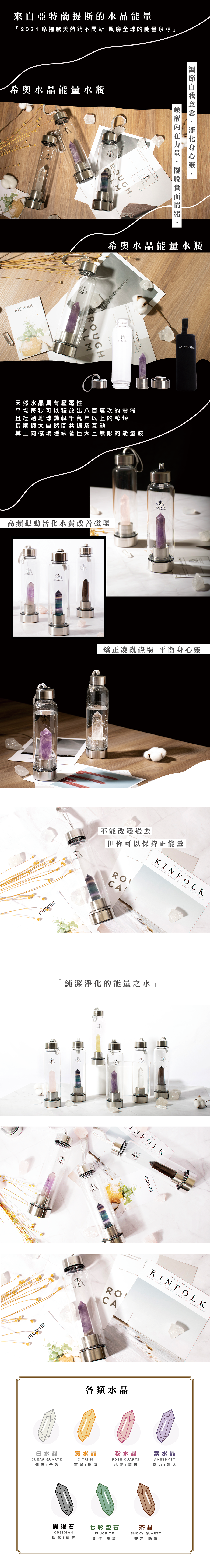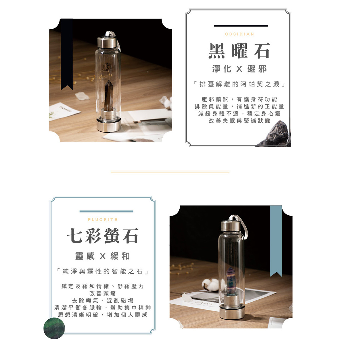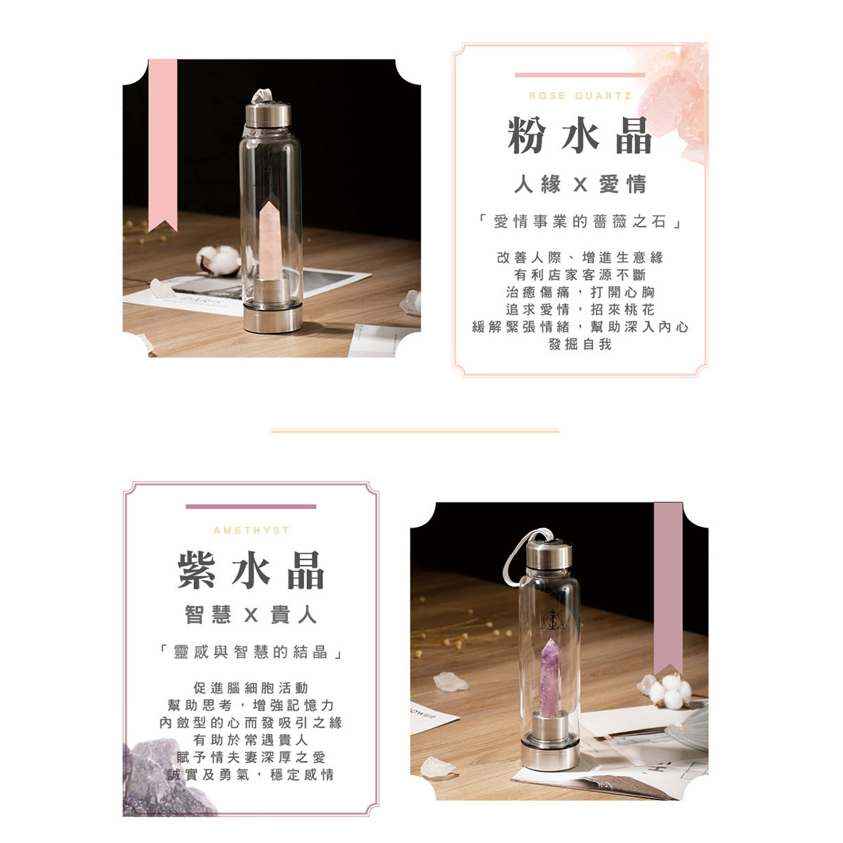 ※ 由於玻璃水瓶及水晶柱皆為手工打造,表面有些許劃痕、缺礦皆為正常現象。非常感謝您理解天然水晶以及手工製品的獨一無二及不易。