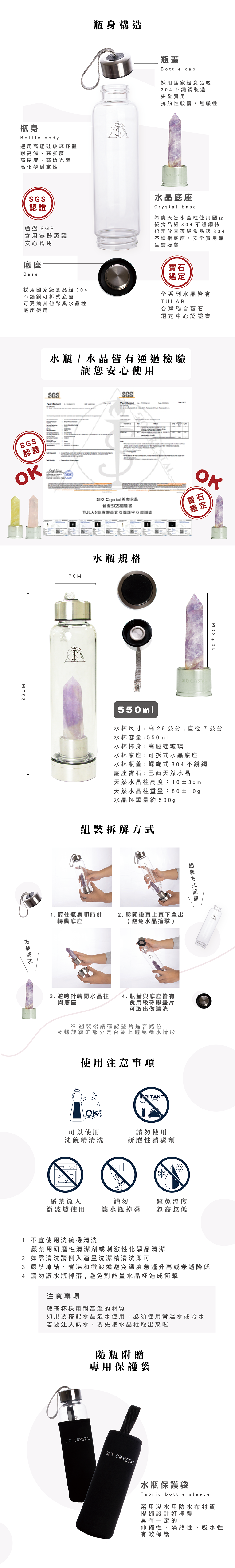 ※ 由於玻璃水瓶及水晶柱皆為手工打造,表面有些許劃痕、缺礦皆為正常現象。非常感謝您理解天然水晶以及手工製品的獨一無二及不易。